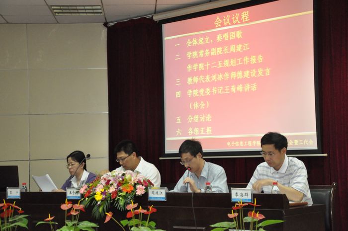 会上,学院常务副院长周建江作了学院“十二五”规划工作报告,介绍了学院在学科建设、科学研究、师资队伍、学生培养等方面的现状,分析了未来学院发展环境,提出了今后发展目标。教师代表刘冰随后作师德建设发言,分享“为人师”的心得和感悟。学院党委书记王奇峰公布了学校“践行师德创先争优、办人民满意教育”主题实践活动安排表,解读了《学院公益分计算办法》,这调动了学院广大教师参与公益活动的自觉性和积极性。休会期间,全体与会教职工进行分组讨论,大家积极为学院发展建言献策。
