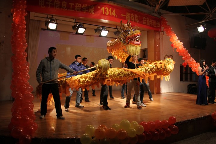 晚会在动感十足的舞蹈“江南STYLE”中拉开了序幕,接下来是乐器独奏、双人舞、相声、小品、歌曲串烧、舞龙表演等形式多样的节目。其中,相声《当行论》和大四学生带来的小品《寺院甄�传》则发挥了十足的搞笑功力,将全场气氛推向高潮。晚会的另一大亮点是由四院的十佳歌手代表周文柏、许金带来的歌曲《因为爱情》和新晋十佳白金奖获得者罗迪带来的《一路上有你》,十佳歌手们的动人演绎让在座观众陶醉不已。互动环节也亮点多多,第一个互动环节中,学院党委书记冯绍红老师和副书记季海群老师亲身向同学们示范绕口令;第二个互动环节中,由主持人扮演的末日奶牛在互动中惩罚四院同学,最后由四院勇士袁李华老师射杀末日奶牛为同学们主持正义,精彩的桥段让在座老师同学们捧腹不已。随后,各学院学生会主席通过视频向现场的老师和同学们送来新年的祝福。最后,周建江院长向在座老师和同学们发出了新年的祝福,并希望同学们好好学习,全面发展。