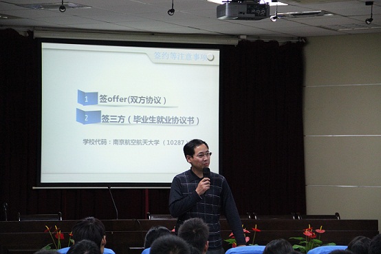 随后学院党委副书记季海群根据往届的就业情况以及今年就业形势,分析了用人单位招聘趋势,指出面对就业压力,要抓住机遇。最后,季书记还向同学们强调了签约时的一些注意事项。