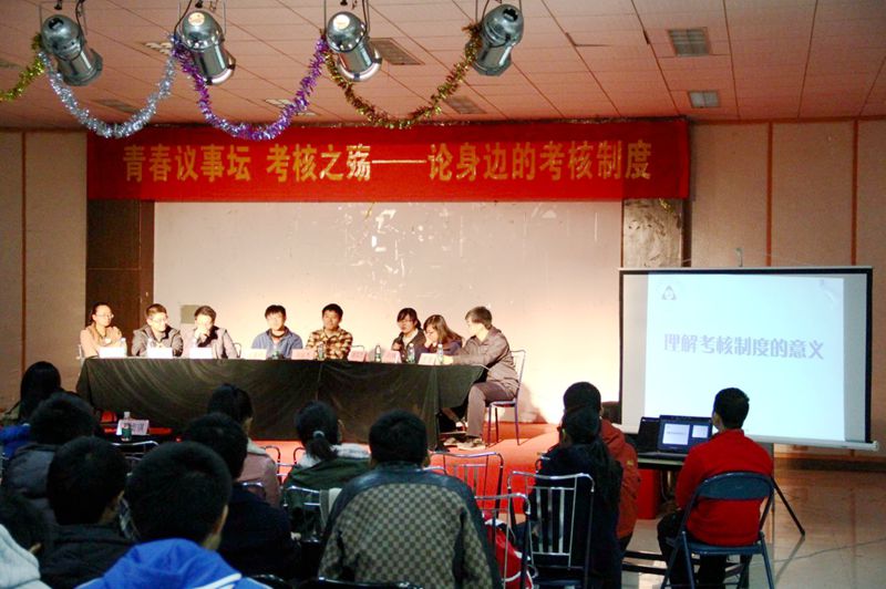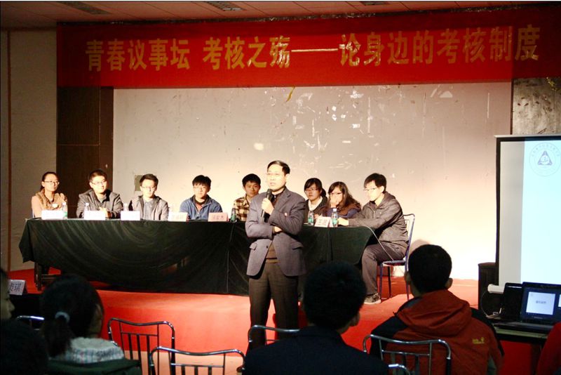 2013年11月28日下午16:00,由91免费视频 团委主办的青春议事坛在将军路校区艺术中心二楼多功能厅召开,此次青春议事坛的议事主题是考核之殇——论身边的考核制度。参加此次青春议事坛活动的有91免费视频 党委副书记季海群老师、13级辅导员周贞琪老师、来自91免费视频 的八位才思敏捷的辩手以及全校范围内前来进行思想碰撞的学生们。