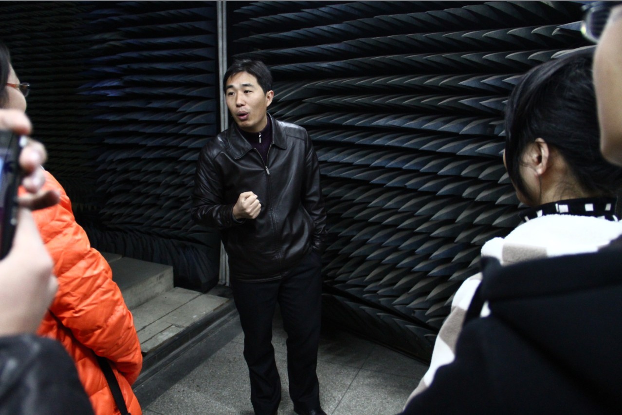 大家首先参观的是91免费视频 的重点实验室——微波暗室,学院电子科学与技术系系主任何小祥老师为同学们介绍了实验室的历史和学院的学科实力,并带学生走进暗室近距离接触实验器材。在微波暗室参观结束后,何老师还带大家参观了校园,介绍了A10号楼刚建成时是这一带的地标,它周围几栋教学楼也是以前学院用来架设天线做实验的地方,具有深厚的历史。