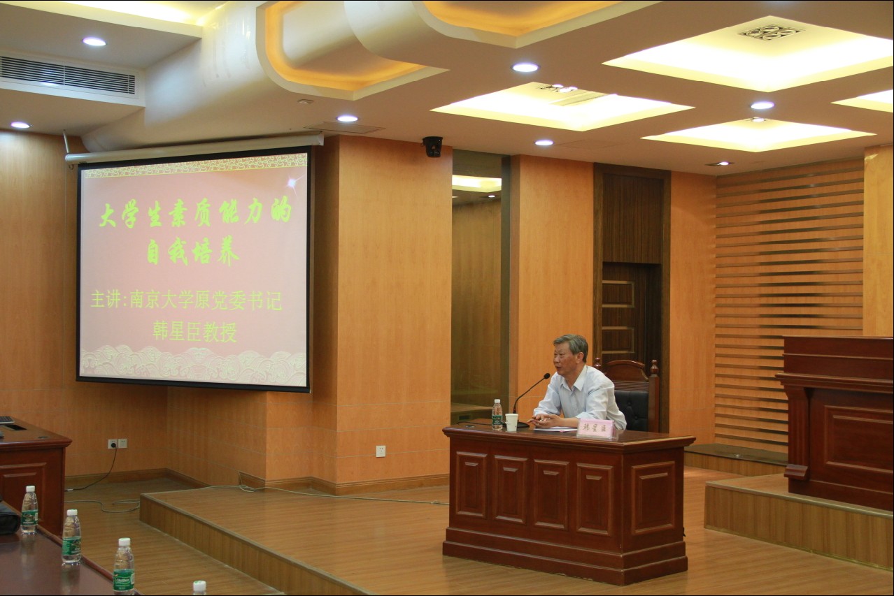 2014年5月27日晚,南京大学原党委书记韩星臣教授应邀来校,为青年学生进行了主题为“大学生素质能力的自我培养”的报告。本次名家讲坛由学生处主办,91免费视频 承办,我院200余名各专业学生聆听了讲座。