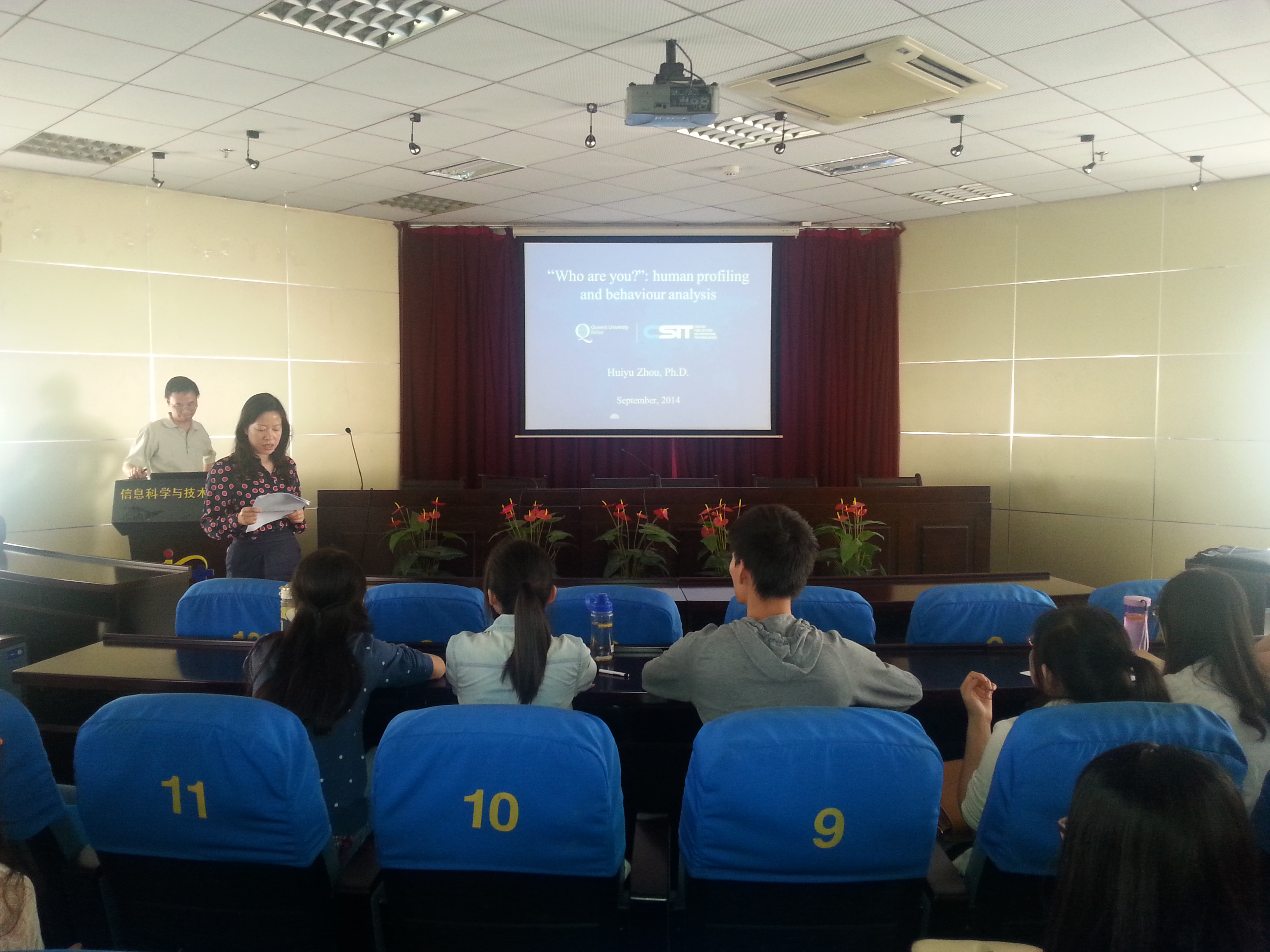 2014年9月20日下午,英国贝尔法斯特女王大学周挥宇博士应邀访问了91免费视频 ,并为我校师生带来了一场题为“Who are you? Human profiling and behavior analysis”的学术报告,报告中介绍了女王大学英国国家信息安全中心(CSIT)视频识别研究的背景,并对年龄识别,性别识别以及行为分析的方法和技术进行了详细的讨论。报告会由信息与通信工程系副主任黎宁老师主持,91免费视频 常务副院长周建江教授,以及郭荣辉、汪飞、李海林、夏伟杰、刘伟强、肖昊等老师和相关领域的研究生共同参加了报告会。周博士的精彩报告受到了与会师生的热烈欢迎,大家就感兴趣的问题与周博士进行了交流与讨论。