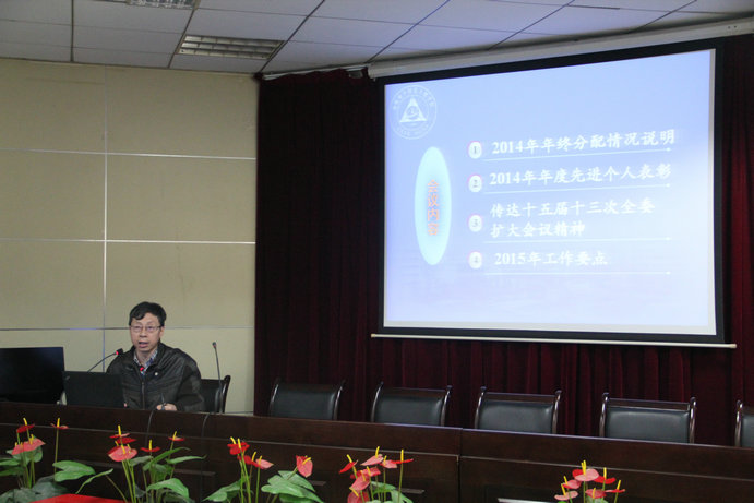 会上,常务副院长周建江做《2014年工作总结和2015年工作要点》工作报告,报告首先传达了学校十五届十三次全委扩大会议精神,并结合学校2014年工作回顾,对学院工作进行总结,分析自身的优势和不足,重点分析了人才工作对于学院发展的重要性,分析了“做强”与“做大”之间相辅相成的关系,希望广大教师能够积极参与到学院人才引进工作中来,为人才引进工作出谋划策。随后,周院长从本科教学、研究生教学、学科建设、科研工作、学生工作、党建工作等各个方面对2015年工作进行了部署。周院长表示,在过去的一年,全院教职工兢兢业业,学院各项工作取得了喜人的成绩,2015年是学校深化校内综合改革的关键一年,希望全体教工坚定改革的信念,贯彻落实各项工作,全力推动学院各项工作再上新台阶。