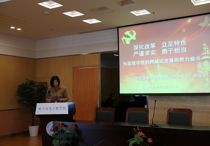 大会在庄严的国歌声中开幕。学院第一届党委委员、常务副院长周建江受筹备组委托作了大会筹备情况的报告。龚平同志受筹备组委托向大会做了党费收缴使用情况的报告。冯绍红同志代表第一届党委作了题为《深化改革,立足特色,严谨求实,勇于担当,为实现学院的跨越式发展而努力奋斗》的工作报告。报告回顾了第一届党委的主要工作,分析了当前学院面临的重大发展机遇、存在的发展瓶颈及主要问题,并提出了今后四年的工作思路:全面贯彻党的十八大、十八届三中、四中、五中全会精神,积极落实校党委关于深化校内综合改革的决议精神,全面适应新一代信息化技术、“中国制造2025”和创新型人才的需求,深化学院改革,立足学院特色,努力实现学院的跨越式发展。报告指出今后四年的主要工作任务是:坚持引培并举,打造高水平师资队伍;凝练学科布局,提升学科发展动力;提升科研水平,丰富学术成果;优化育人机制,提高人才培养质量;实施管理体制机制改革,提升学院管理水平。报告还就全面加强和改进学院党的建设进行了阐述。