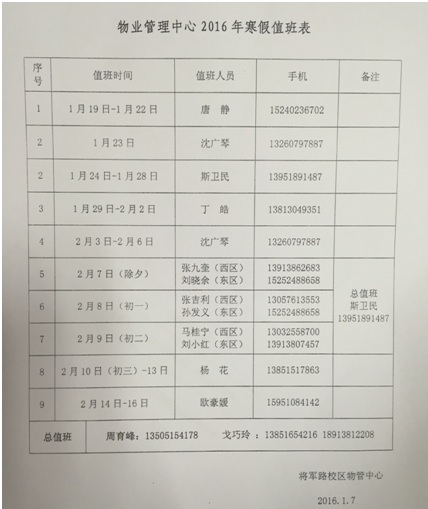 2) 教工:因工程教育专业认证准备工作需要,原则上,在2016年1月18日至1月28日期间,所有教职员工需留在南京,做到有需要可以及时赶到办公室。其他时间安排由各工作组负责详细布置。寒假开学时间为:2月21日(星期日)正常上班。