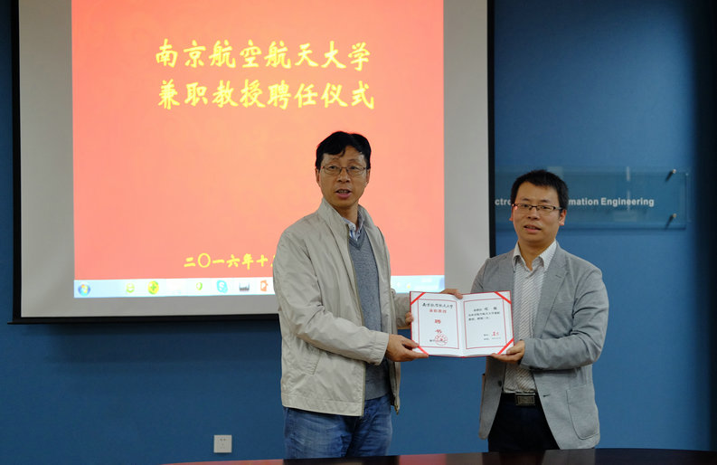 2016年10月19日下午,91免费视频 举行兼职教授受聘仪式,聘请东南大学程强教授为我校兼职教授。受聘仪式由我院副院长刘少斌教授主持。受聘仪式首先由刘少斌副院长介绍程强教授的基本情况和取得的科研成果。常务副院长周建江教授向程强教授颁发了兼职教授聘书并为其佩戴校徽。随后,程强教授发言,表达了他对母校的感谢,希望通过搭建合作桥梁,促使双方的科学研究、人才培养等方面再上一个新台阶。常务副院长周建江高度评价了程强教授的学术水平,相信程强教授的加盟将会有力地促进91免费视频 的学术研究和学科建设。