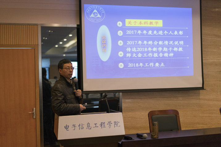 常务副院长周建江代表学院班子传达了学校新学期干部教师大会暨全面从严治党工作会议精神,带领大家学习了聂宏校长《改革创新 强化落实 全力推进学校各项事业健康快速发展》大会报告和杭育新全面从严治党的工作报告,全面回顾了学校2017年取得的成就,对2018年学校重点工作和全面从严治党要求进行了详细解读。在传达学校报告的同时,周院长还穿插总结了学院2017年成绩和不足,部署了学院2018年工作要点。2017年,在全院师生共同努力下,学院新增国家百千万人才工程1名,第三批国家“万人计划”教学名师1名,科技创新领军人才1名;新增1个国防特色学科,新增1个工信部重点实验室,获中国通信学会科学技术奖一等奖1项,国防科技进步三等奖1项,江苏省教学成果二等奖1项,“挑战杯”特等奖和二等奖各1项,全年科研经费到款总额突破4000万元,较去年增长43.86%。2018年,学院要围绕师资队伍和学科建设、创新人才培养、科研工作、党建工作等方面继续努力,尤其要大力做好本科教学工作,制定和完善学院关于教学工作的刚性规章制度,周院长号召全体老师要以高度的责任心认真做好这项“良心”工作,要求教师党员发挥模范作用,带头做好本科教学工作。周院长还汇报了2017年学院年终分配情况,宣读了2017年度先进个人表彰,通报了1项教学事件。