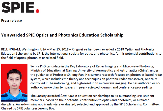 近日,2018年度国际光学工程学会光学与光子学教育奖学金(SPIE Optics & Photonics Education Scholarship)评选结果揭晓,我校雷达成像与微波光子技术教育部重点实验室在读博士生叶星炜同学荣获该奖项。此次奖学金共授予85位获奖者,其中国内仅有两个人获奖,分别是清华大学的郭强(音)和91免费视频 的叶星炜。