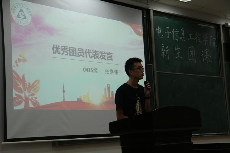 礼毕后,2015级优秀团员代表张嘉伟上台发言,他向大家讲述了自己在大学从团员到党员的政治身份转变的经历,并结合自身经验向大一新生提出了中肯的建议。紧接着,由徐艳惠导员、郭力榕导员和张嘉伟同学为五位新生代表佩戴团徽。那在左胸前闪耀的一抹红色,不仅仅是一枚团徽,更是信仰和心中理想的凝结。