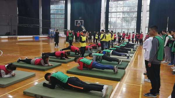 尽管12月的南京寒气袭人,但同学们依然兴致盎然,运动会还没有开始,大家就已经早早的聚集在篮球场上做热身运动,并按照一系、二系分成两组。