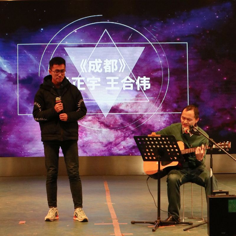 最后我们迎来了全场晚会的高潮部分——师生合唱节目。黄正宇老师和王合伟同学合作演出吉他弹唱《成都》,默契的配合展现了师生关系的和谐有爱。