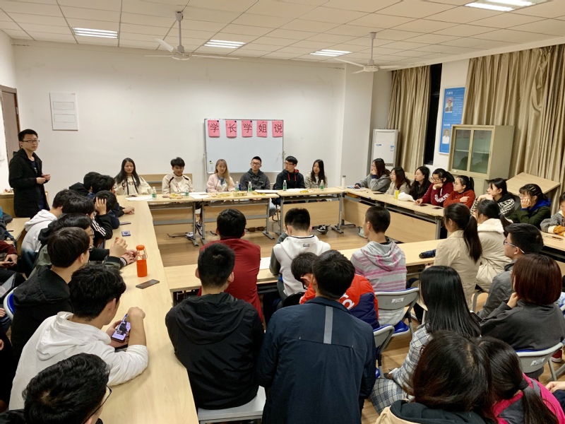 4月18日,“考研”专场经验交流会上,2015级学长学姐们从考研选择、复习安排、专业课学习、心态调整等方面为2016级同学分享考研经验和成功案例。