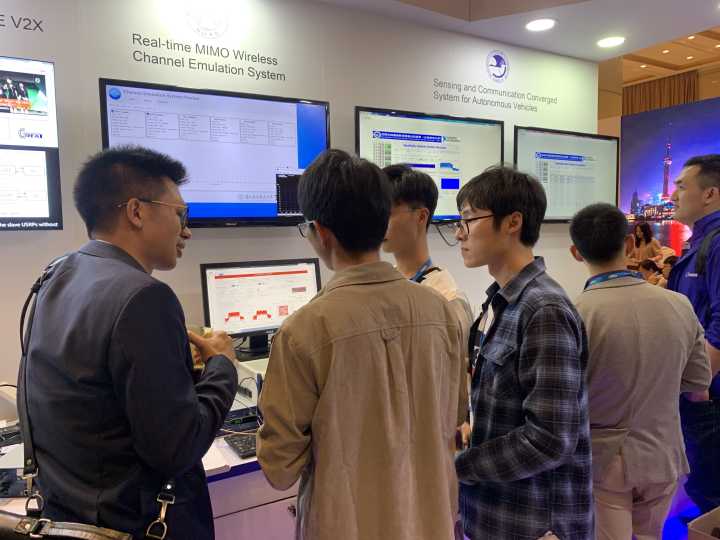 会展期间,该信道模拟器受到了国内外数百位同行专家、参会人员及行业从业者的广泛关注,我院学生毛开、黄文清、张冬洋和NI工程师,为参观人员精心讲解、耐心解惑,并展开了热烈讨论,给众多参会者留下了深刻印象。