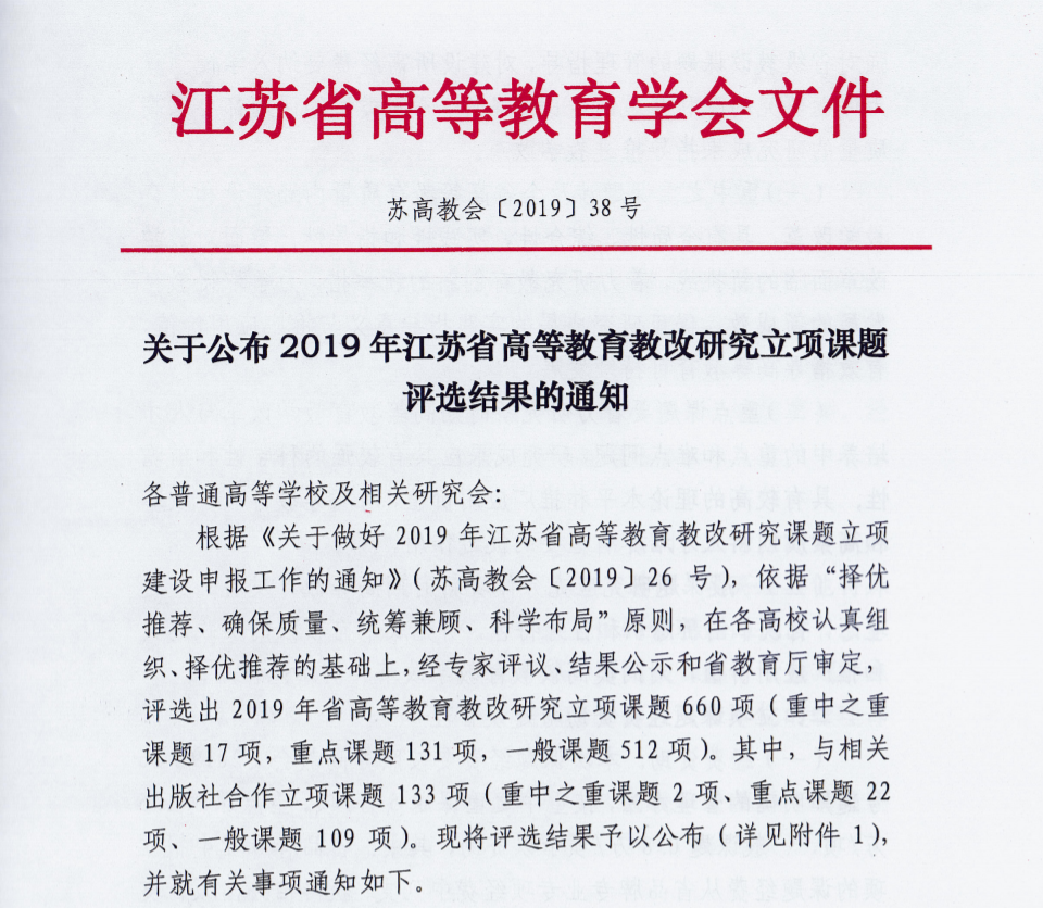 2019年12月10日,江苏省高等教育学会发布了《关于公布2019年江苏省高等教育教改研究立项课题评选结果的通知》,91免费视频