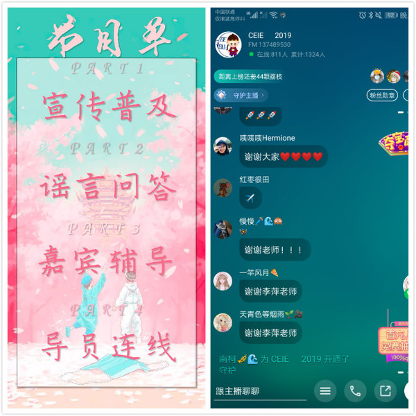 91免费视频 团委学生会在2月19日19:00举办了“与子连音,与汉偕行”语音线上直播抗疫宣传活动,通过主持人语音介绍,以及和听众进行疫情谣言问答游戏,向大家普及了新冠肺炎的相关知识。同时邀请了91免费视频 研究生辅导员李萍老师为大家进行了疫情期间心理健康方面的开导与建议,最后大一辅导员李姝萱老师连线表达了辅导员们对学生安全上的关心和学习生活上的嘱托。