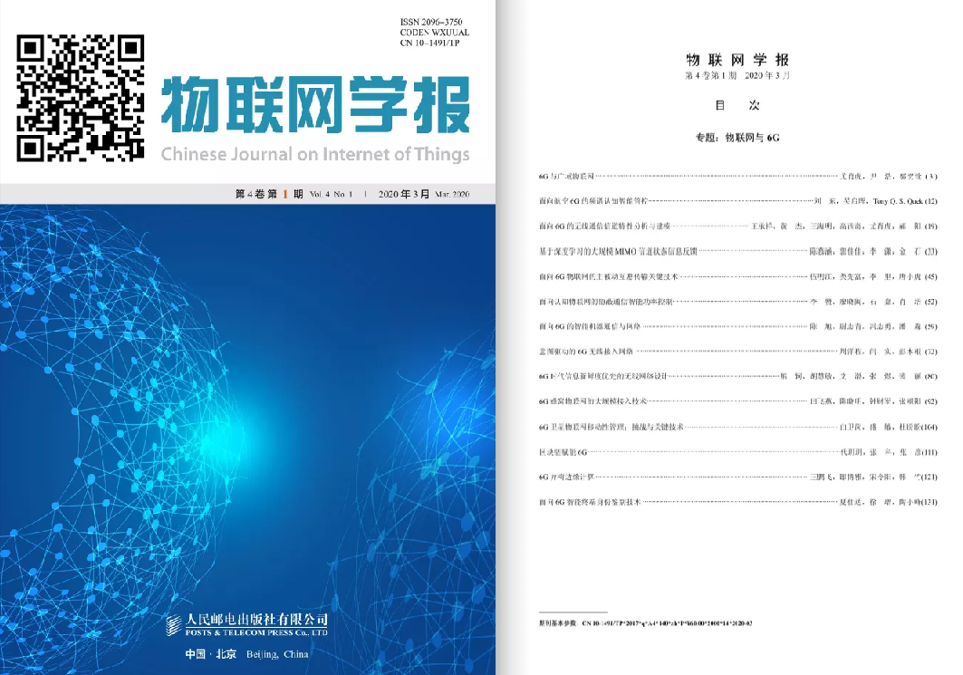 《物联网学报》2020年“物联网与6G”专题新鲜出炉,该专题是在中国科学院尹浩院士和南京邮电大学原副校长朱洪波教授的指导下,我院吴启晖教授策划,新加坡科技设计大学信息系统技术与设计学院Tony. Q. S. Quek教授、东南大学移动通信国家重点实验室王承祥教授和金石教授、浙江大学信息与电子工程学院信息与通信工程系张朝阳教授、挪威奥斯陆大学张彦教授、北京大学信息与通信研究所宋令阳教授等多位本学报编委共同参与完成的。14篇文章由东南大学尤肖虎教授、中国科学院尹浩院士、中国工程院邬贺铨院士联合署名的特邀论文,及国内外通信领域十余位知名专家的邀稿论文构成,是国内关于物联网与6G的学术前沿专题。