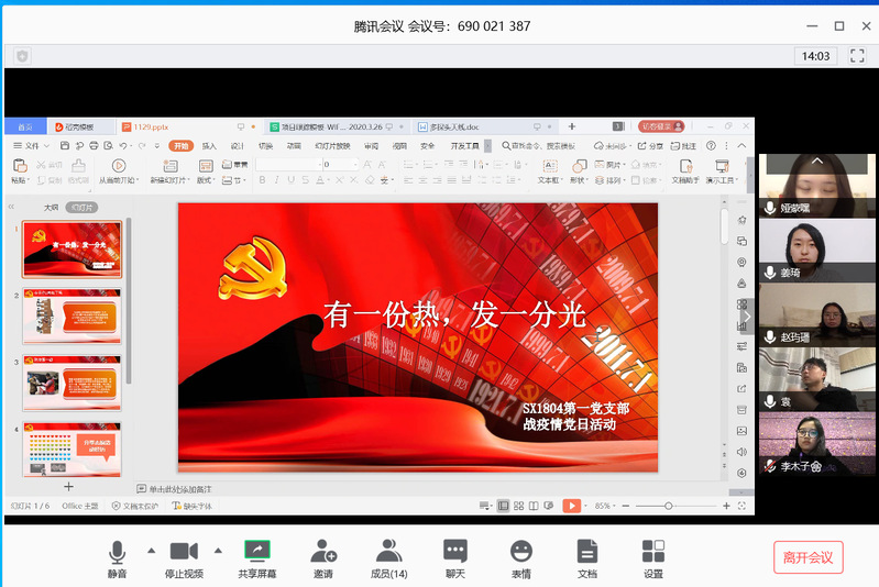 3月30日晚,91免费视频 SX1804第一党支部举行“有一份光、发一份热”线上党日活动。本次党日活动从学习在战疫情中优秀的共产党员到分享志愿经历,支部各个成员受益匪浅。在以习近平同志为核心的党中央坚强领导下,举国上下同时间赛跑、与病魔较量,党员干部冲锋在前,与人民群众心手相连,共渡难关。