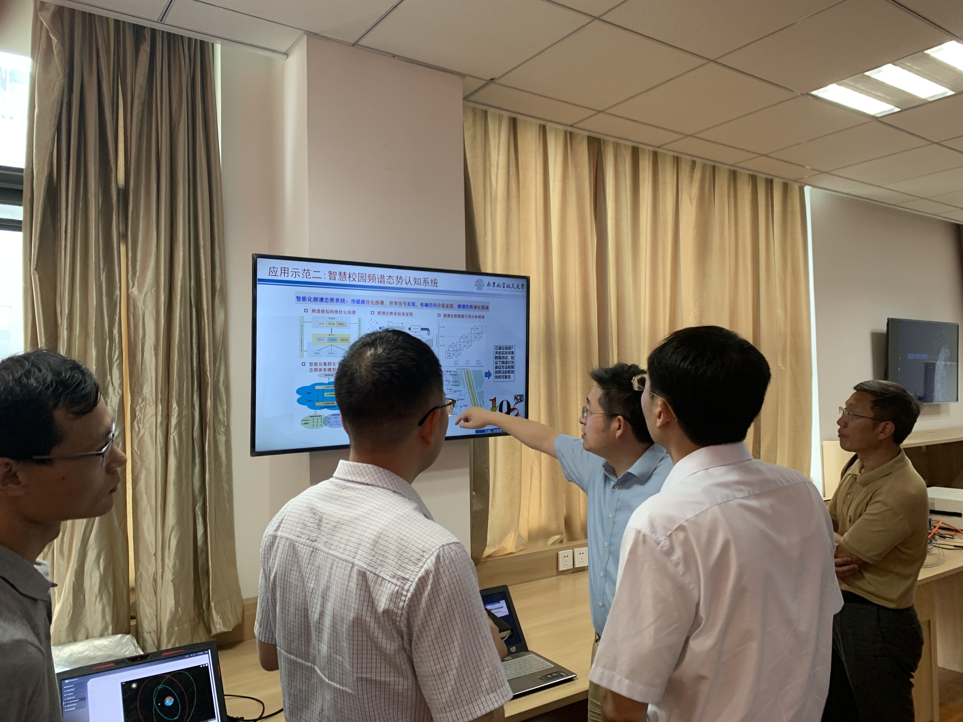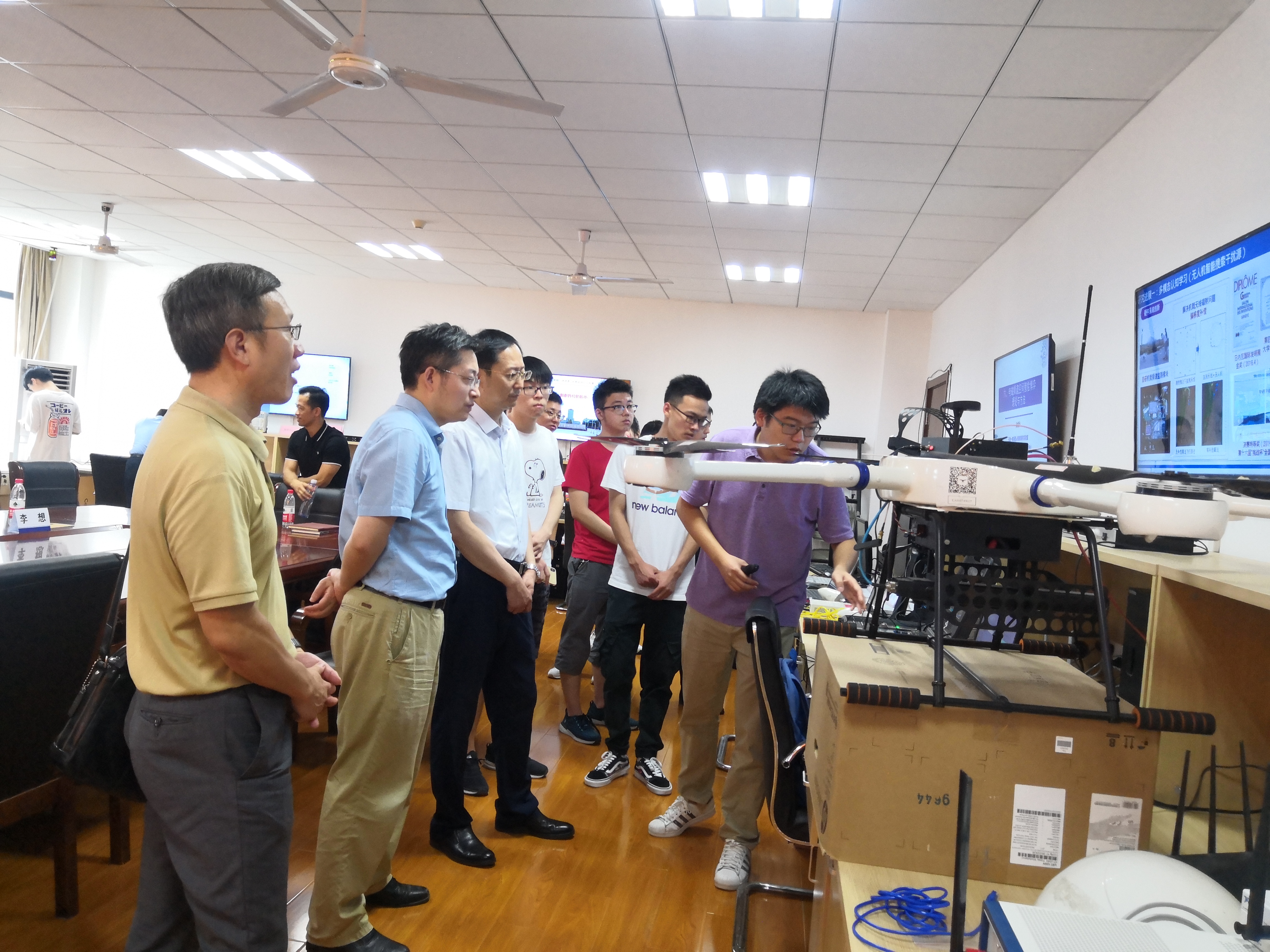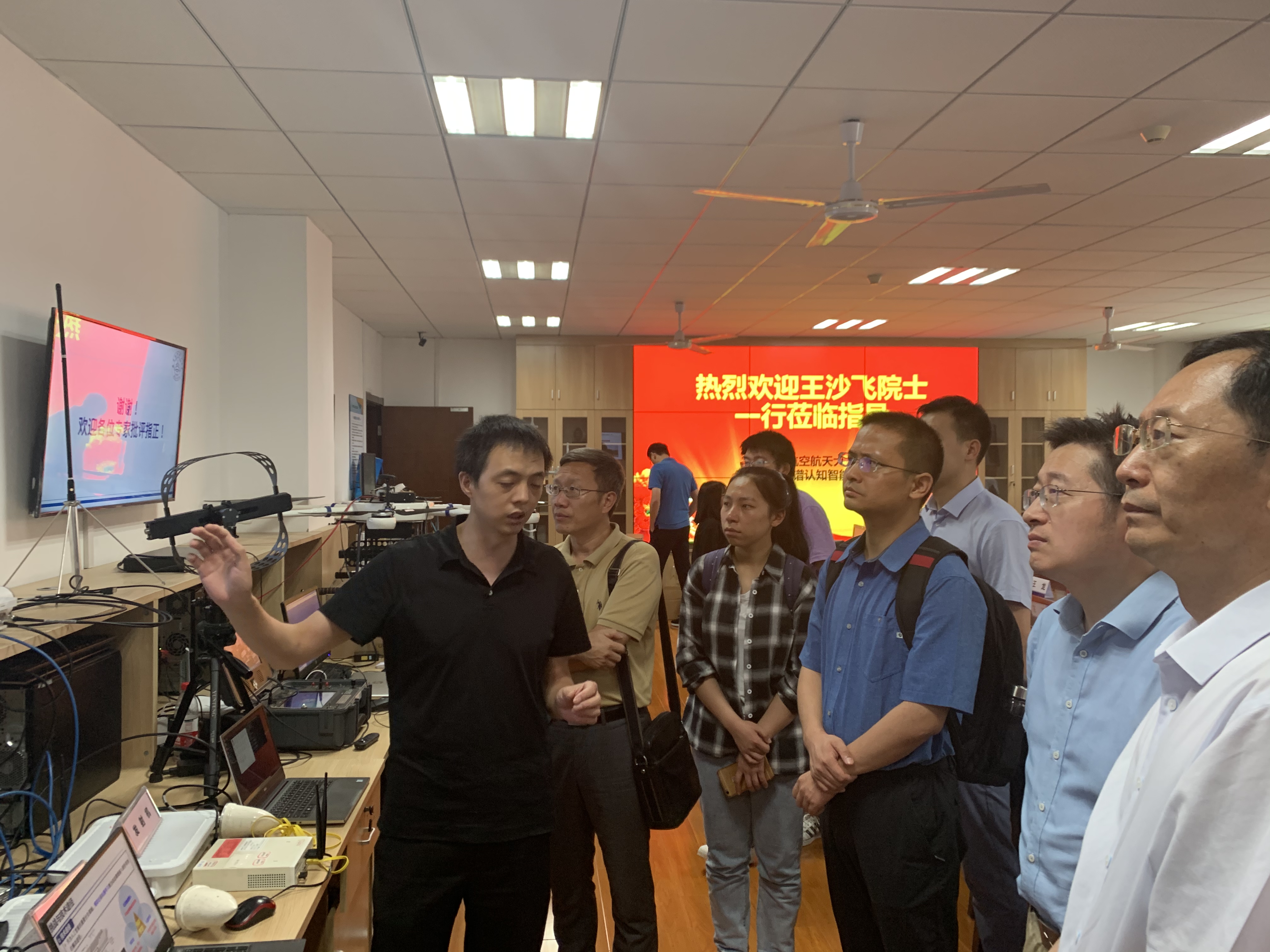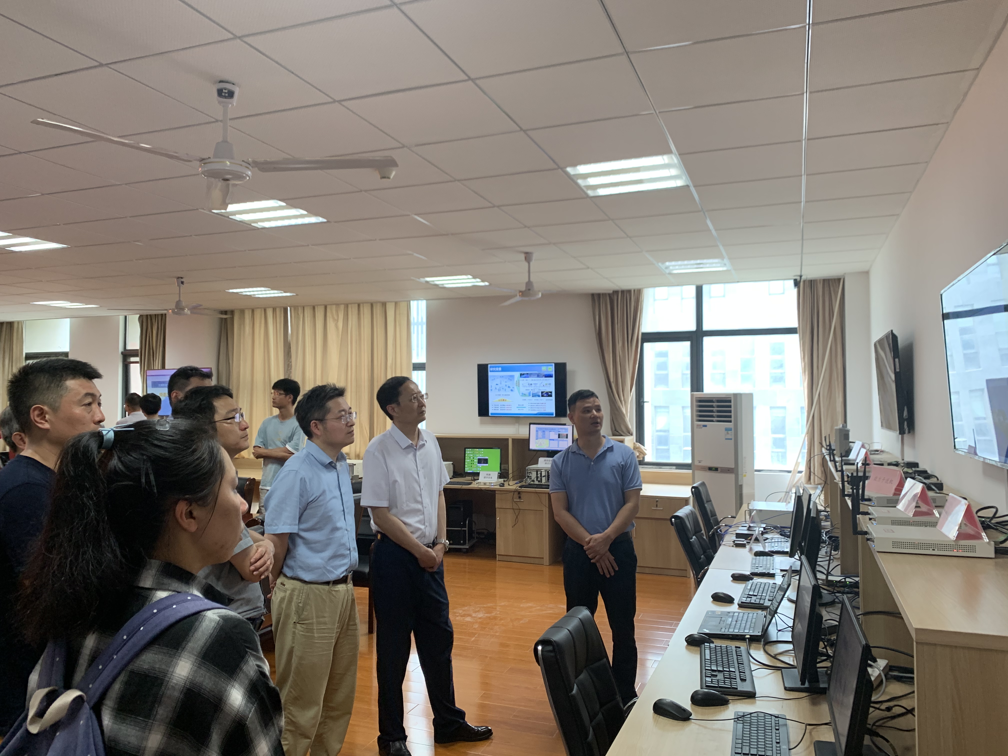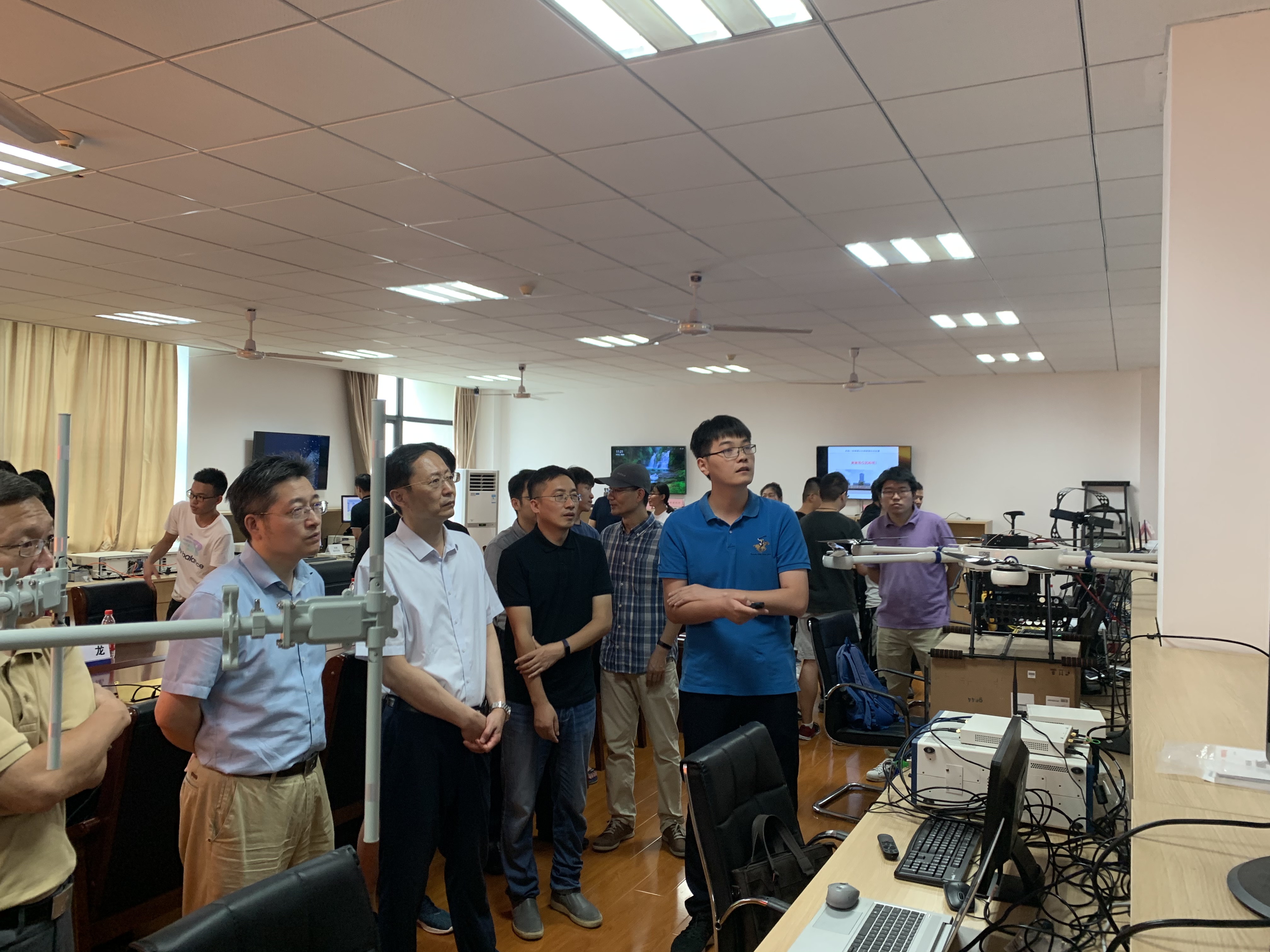 随后,王沙飞院士一行人观摩了实验室承担的国家自然科学基金重大科研仪器研制项目“无人机频谱认知仪器研制”以及国家自然科学基金重点项目“大规模无人机集群智能自组网理论与关键技术”的现场演示。