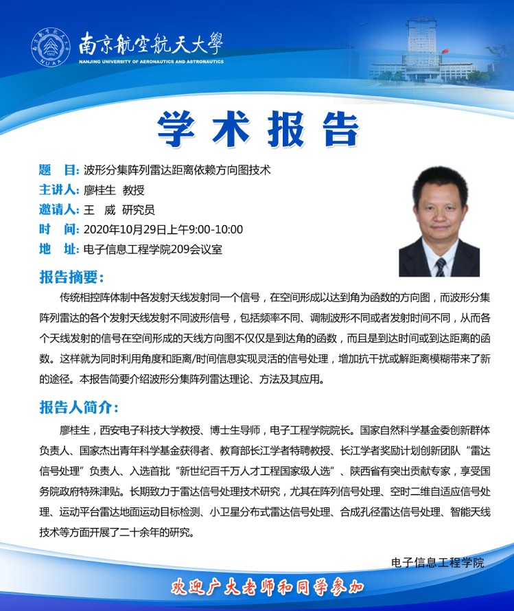 学术报告——波形分集阵列雷达距离依赖方向图技术