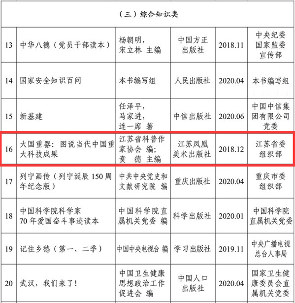 近日,中央组织部党员教育中心、中央宣传部出版局、国家图书馆联合举办第五届全国党员教育培训教材展示交流活动。此次活动聚焦巩固深化“不忘初心、牢记使命”主题教育成果、决胜全面建成小康社会、决战脱贫攻坚、打赢疫情防控阻击战等重大主题,通过资格审查、专家评审、基层评价、复核把关等环节层层选拔,由我院院长贲德院士主编的《大国重器:图说当代中国重大科技成果》成功入选第五届全国党员教育培训创新教材,该书曾先后荣获科技部优秀科普作品奖、第十四届文津图书奖。2018年,入选中央宣传部办公厅和国家新闻出版广电总局“2018年重点主题出版物选题目录”,2020年4月,列入《教育部基础教育课程教材发展中心 中小学生阅读指导目录(2020年版)》。