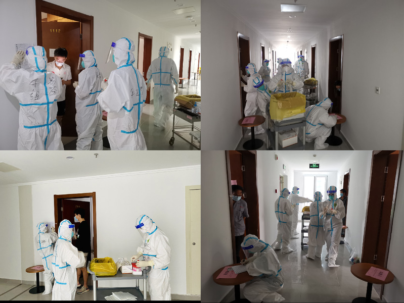 经过一上午的齐心协作,我院教职工志愿者队伍配合医生顺利完成了近两百名集中观察学生的核酸检测工作。当志愿者老师们看到自己正在隔离的学生,关切地询问他们的身体情况。暑日闷热,防护服内已浸满汗水,教职工志愿者们表示更能够切实体会一线医务工作者及志愿者的不易与辛劳,向他们致敬!同时,他们表示能为学生们服务是十分高兴且义不容辞的事情,也希望南航师生们能够平安健康,共同打好这场疫情阻击战!