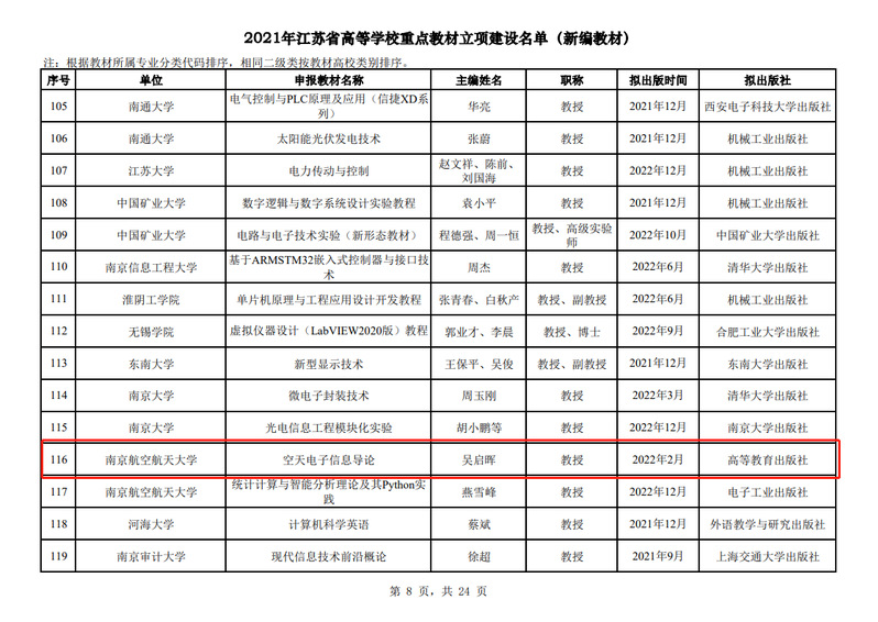 近日,江苏省高等教育学会公布了2021年江苏省高等学校重点教材立项建设名单(苏高教会〔2021〕39号),我院由吴启晖教授牵头新编的《空天电子信息导论》教材获批省重点教材立项。