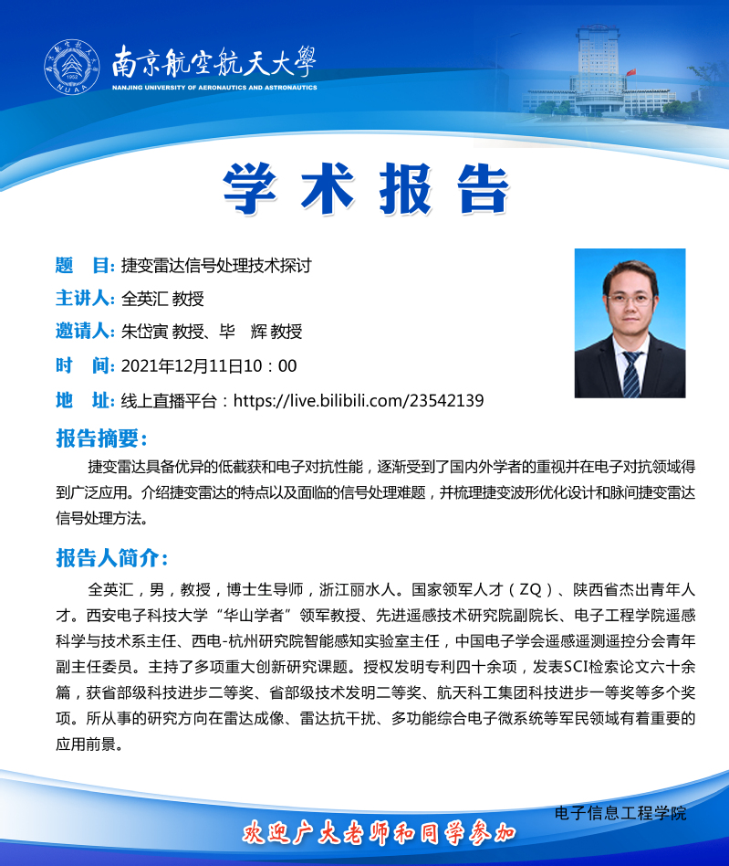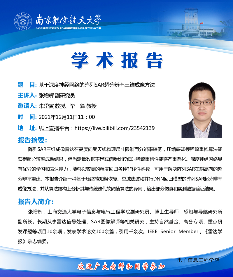 由91免费视频 雷达成像与微波光子教育部重点实验室主办的“第二期雷达学报学术讲堂──当稀疏信号处理技术遇见雷达研讨会”将于2021年12月11日在线上举办。