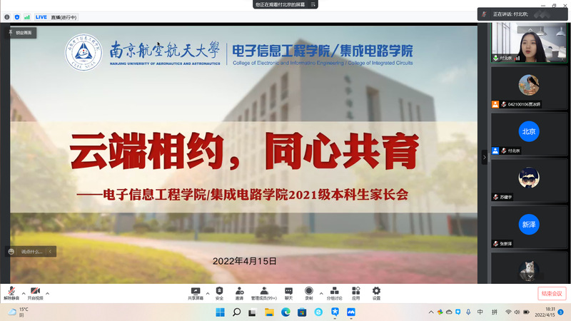 付北京从“思想引领、学习情况、科创竞赛、文化活动”四个方面向家长讲述学生入学以来丰富的大学校园生活,让家长进一步了解学生在校学习情况及开展活动情况。并希望家长能够配合学校疫情防控工作,共同做好学生的管理和服务工作。