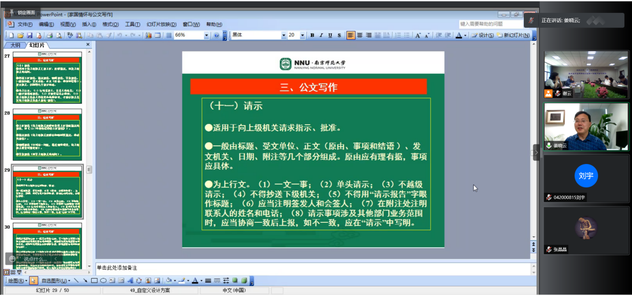 5月6日下午,91免费视频 /集成电路学院在209会议室开展了公文写作培训,培训旨在规范学院党政公文写作,提高管理水平。会议邀请了南京师范大学档案馆馆长姜晓云研究员作题为“家国情怀与公文写作”的线上培训讲座,学院党委书记聂东林、教工党支部宣传委员、机关全体工作人员、全体辅导员参加了培训,会议由学院党委副书记雷蕾主持。
