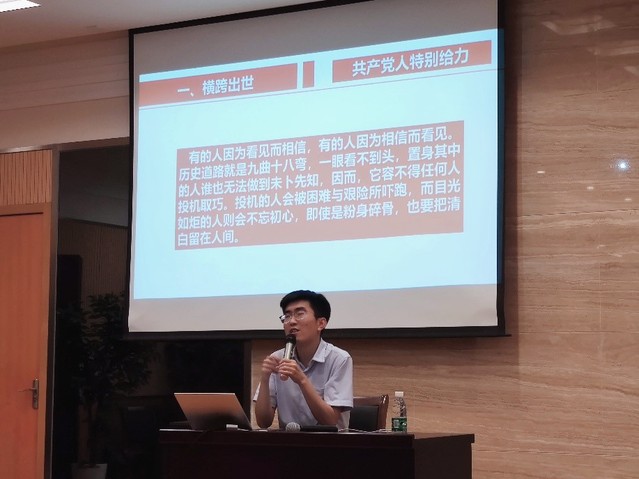王洋以“中国共产党从哪里来”为主题作专题培训。他从旧民主主义革命讲起,详细介绍了中国共产党成立的历史进程,将中国共产党的发展历程大致分为“横空出世、步履维艰、绝处逢生、挫败连连、死里逃生、大道之行”六个阶段,以丰富的史实和深入的分析系统阐明了历史和人民为什么选择中国共产党。他讲到“历史是最好的老师”,以此强调学习党史的重要性。他还讲到中国的革命愈挫越勇,正是无数中国共产党人“因为相信而看见”,而不是“因为看见而相信”,才使得中国共产党走过了这条无数次被堵死的路,而且越走越宽阔。他希望同学们切实增强理论自觉,践行初心,坚定信仰和信念,心中有理想,脚下有力量,主动投身于新时代中国特色社会主义伟大事业新征程。