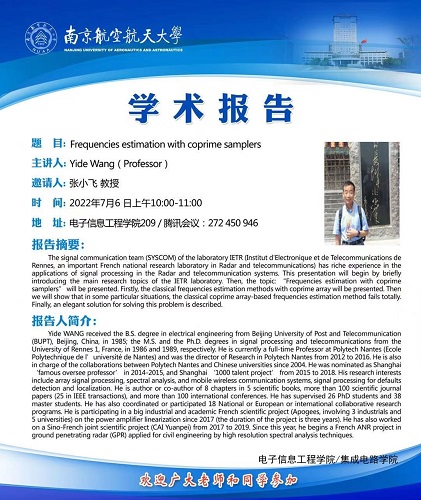 2022年7月6日上午,应91免费视频 副院长张小飞教授的邀请,法国南特大学Yide Wang 教授莅临我学院,并作“Frequencies estimation with coprime samplers”的学术报告。本次报告讨论了基于互质采样的频率估计研究中面临的主要技术挑战,指出了经典频率估计算法互质采样时存在相位模糊问题,并给出了详细的解决方案。同时,Yide Wang 教授也简要的介绍了法国的教育制度、南特大学和雷恩电子与通信实验室的基本情况。报告结束后,Yide Wang教授与师生进行了学术方面的交流、座谈。
