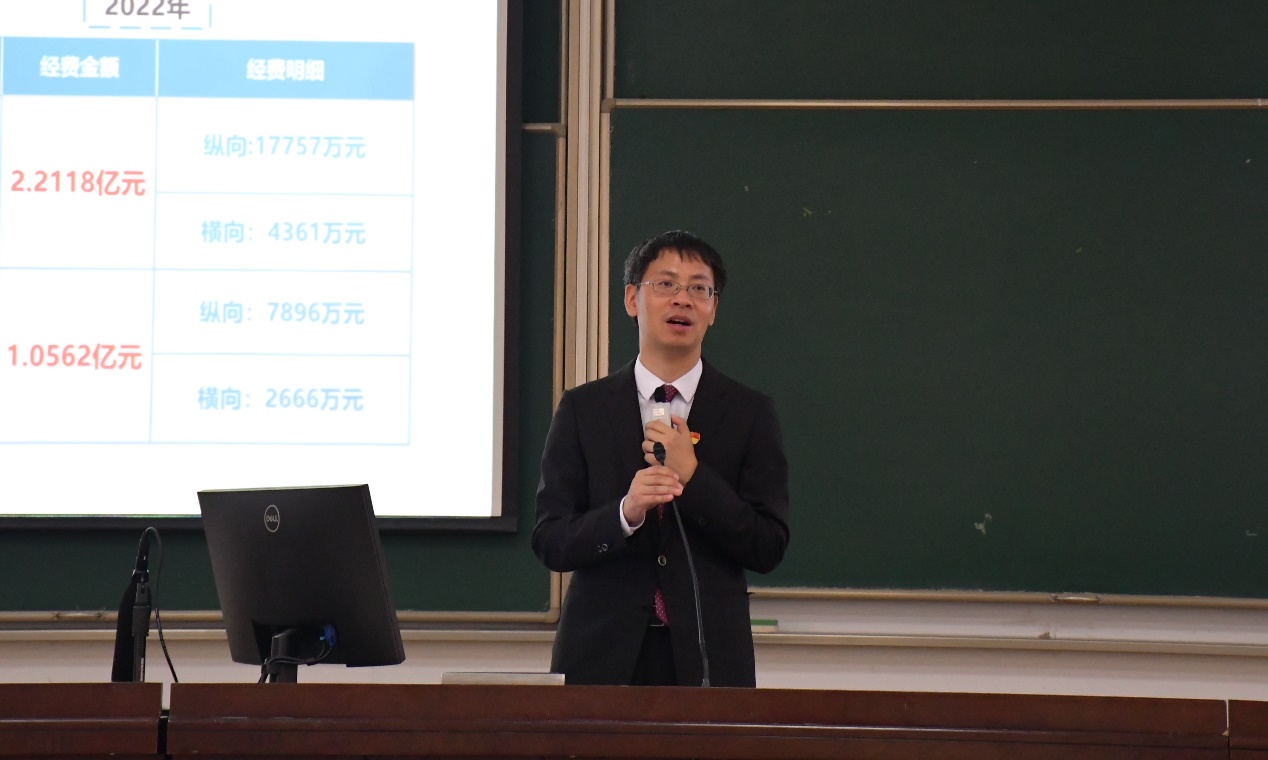 随后,学院常务副院长潘时龙作了“行远自迩、踔厉奋发,实现学院高质量发展”的大会报告,报告从党建工作、学科建设、人才培养、师资队伍、科学研究和国际合作六个方面介绍了学院“十四五”以来学院的发展现状,对学院建设发展近年来取得成绩作了详尽介绍,对全院教职工的努力工作表示感谢。对于学院未来发展,他强调,学院下一个发展目标是争创学校下一个“双一流”学科,全体教职工要牢记立德树人根本任务,以党建工作引领学院思政教育和师德师风建设,培育优良的学院文化;要加大开放办学,走出“象牙塔”思考发展,近年来学院各类平台快速发展,国家级人才数量不断增加,希望学院教职工要充分利用学院构建的平台,借助学院优势资源,加快提升自身水平,瞄准国家重大战略需求,在祖国急需的方向上做出更大贡献;要进一步加强产学研合作,主动对接社会需求,进一步提升成果转化能力。