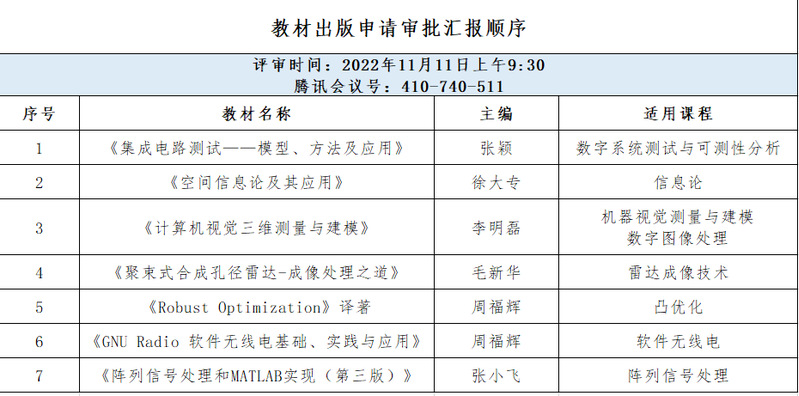 2022年11月11日上午,学院采用线上形式召开了2022年度教材出版前评审工作会议。会议邀请了东南大学副院长徐申教授、南京邮电大学教务处副处长李永涛、河海大学倪建军教授、91免费视频