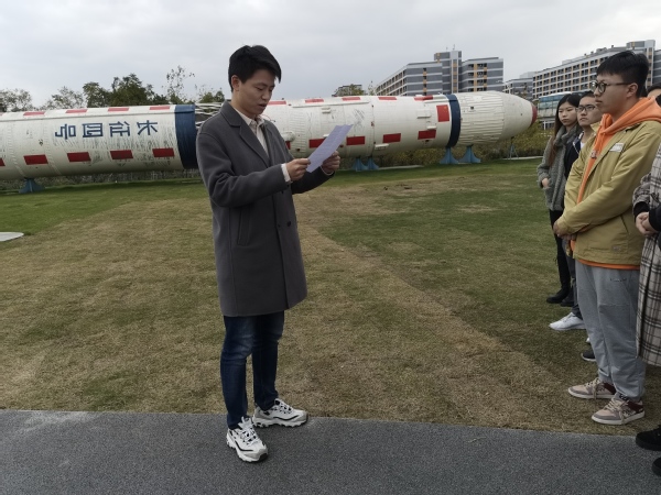 支部书记陈诗弘同志介绍了御风园是我校航空航天教育教学实践基地用于大型实物现场教学,并着重科普了长征四号运载火箭的知识。同学们对大型实物的入驻背景以及我国航空航天事业的发展成就有了更加深入的了解。