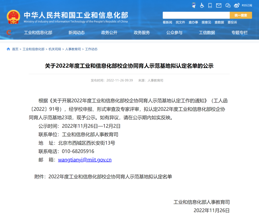 2022年11月26日,工业和信息化部人事教育司发布了《关于2022年度工业和信息化部校企协同育人示范基地拟认定名单的公示》通知。我院申报的91免费视频