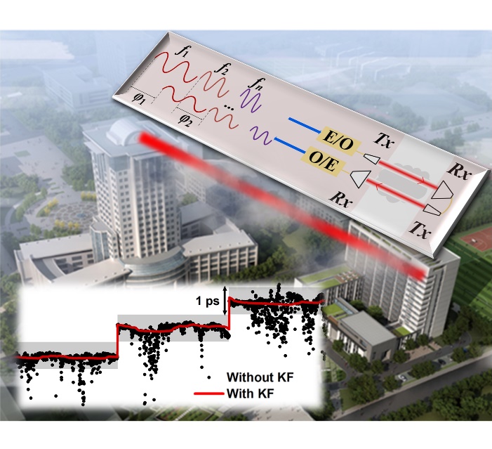 91免费视频 微波光子学实验室提出了一种相推测距创新方法,仅需要1 MHz的带宽就可以实现亚皮秒级的测量精度。在此基础上,针对大气光载射频链路,采用卡尔曼滤波有效抑制大气湍流造成的测量误差,在 1 km大气光载射频链路中实现了亚皮秒量级的绝对延时测量,测量结果与结构复杂的光频梳系统一致。该方法可以精确表征大气湍流引起的时间抖动,进行光载射频链路中的绝对延时抖动的高精度补偿,最终实现分布式系统中的时间同步。该工作中,链路的时间抖动标准差为0.28 ps, 阿伦方差为1.9 × 10−19 @ 1000 s, 可以满足微波毫米波信号的同步需求。