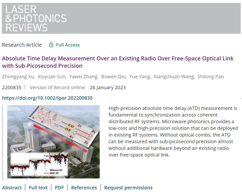 2023年1月26日,我校微波光子学实验室徐忠扬副教授和潘时龙教授团队在国际知名光学期刊Laser & Photonics Reviews上以“Absolute Time Delay Measurement Over an Existing Radio Over Free-Space Optical Link with Sub-Picosecond Precision”为题发表学术论文。该工作采用一种结构简单,低成本的测量方法,在不改变大气光载射频链路结构的情况下,实现亚皮秒精度的链路绝对延时测量。该方法可用于构建分布式相参射频系统。徐忠扬副教授和孙修远博士为论文共同第一作者,潘时龙教授为论文通讯作者。