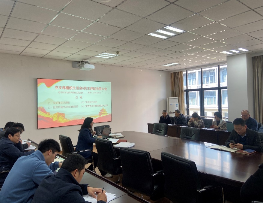 2023年3月3日,电子科学与技术系党支部在学院211会议室召开了组织生活会,开展了党员民主评议。会议由党支部书记朱丹主持,学院党委委员、副院长刘伟强同志参会并做监督点评。组织生活会前,支部集中学习了党的二十大报告和《中国共产党章程》,通过以学促知、以学促思、以学促行,切实把党的二十大精神贯穿到日常科研教学中。