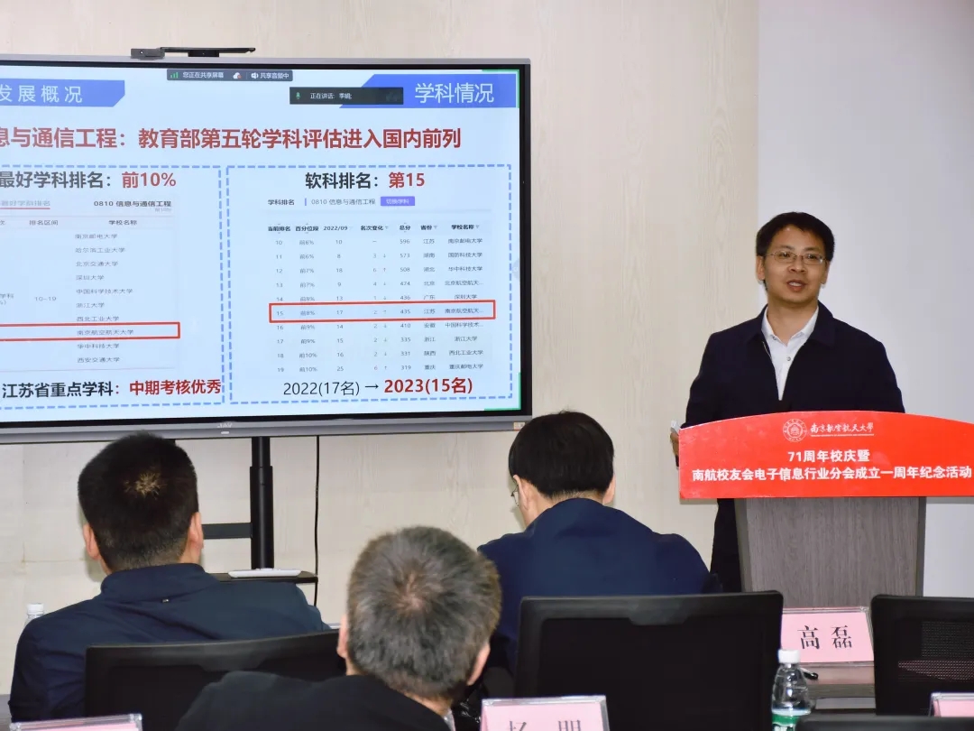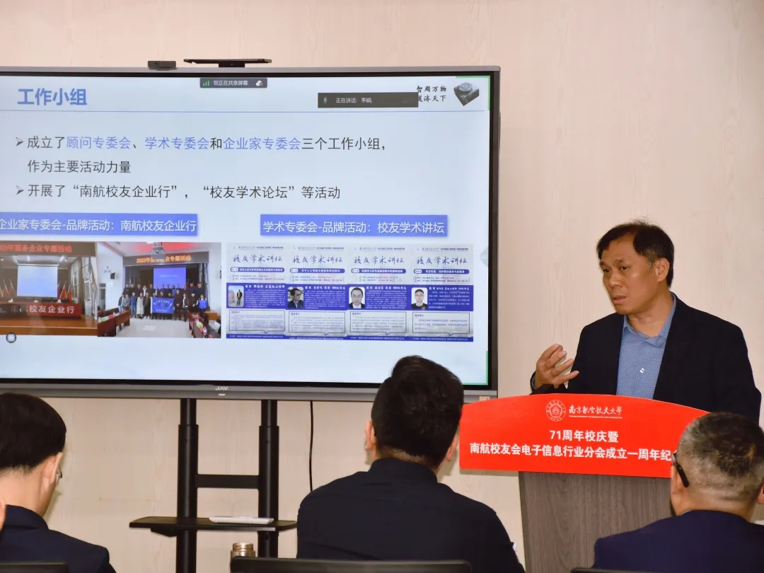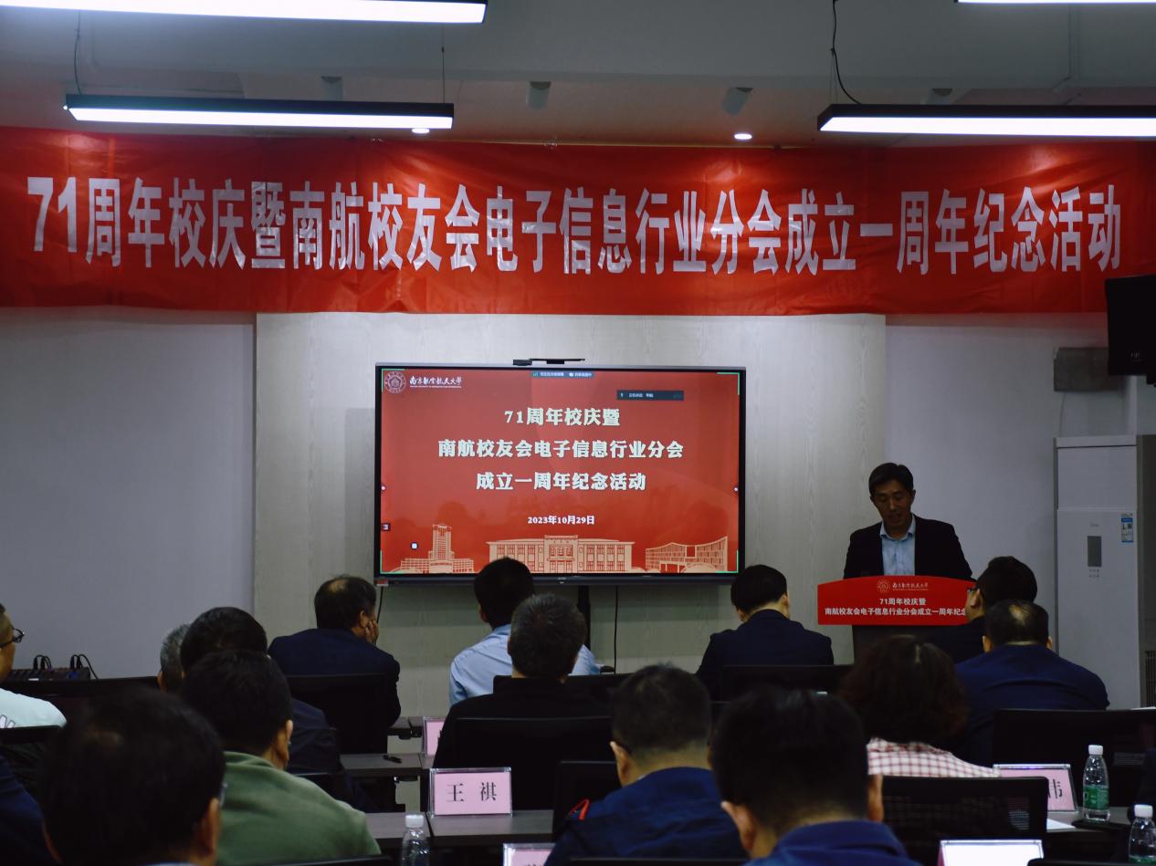 值此南航建校71周年之际,2023年10月29日下午,“71周年校庆暨南航校友会电子信息行业分会成立一周年纪念活动”在南京新工秦淮硅巷柳树湾数创科技园会议中心举行。学校发展联络部部长、校友会秘书长李和新,学院党委书记季海群、常务副院长潘时龙、原党委书记聂东林、副院长刘伟强,特邀嘉宾,电子信息行业分会理事会成员、各专委会成员出席了此次活动。活动分为学术报告和庆祝会议两个阶段,分别由分会副秘书长何小祥、秘书长王腾主持。