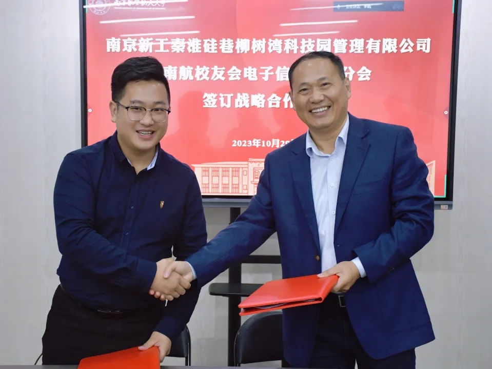 分会秘书长王腾与南京新工秦淮硅巷柳树湾科技园管理有限公司综合管理部主任高磊签署了合作框架协议,并举行了授牌仪式。