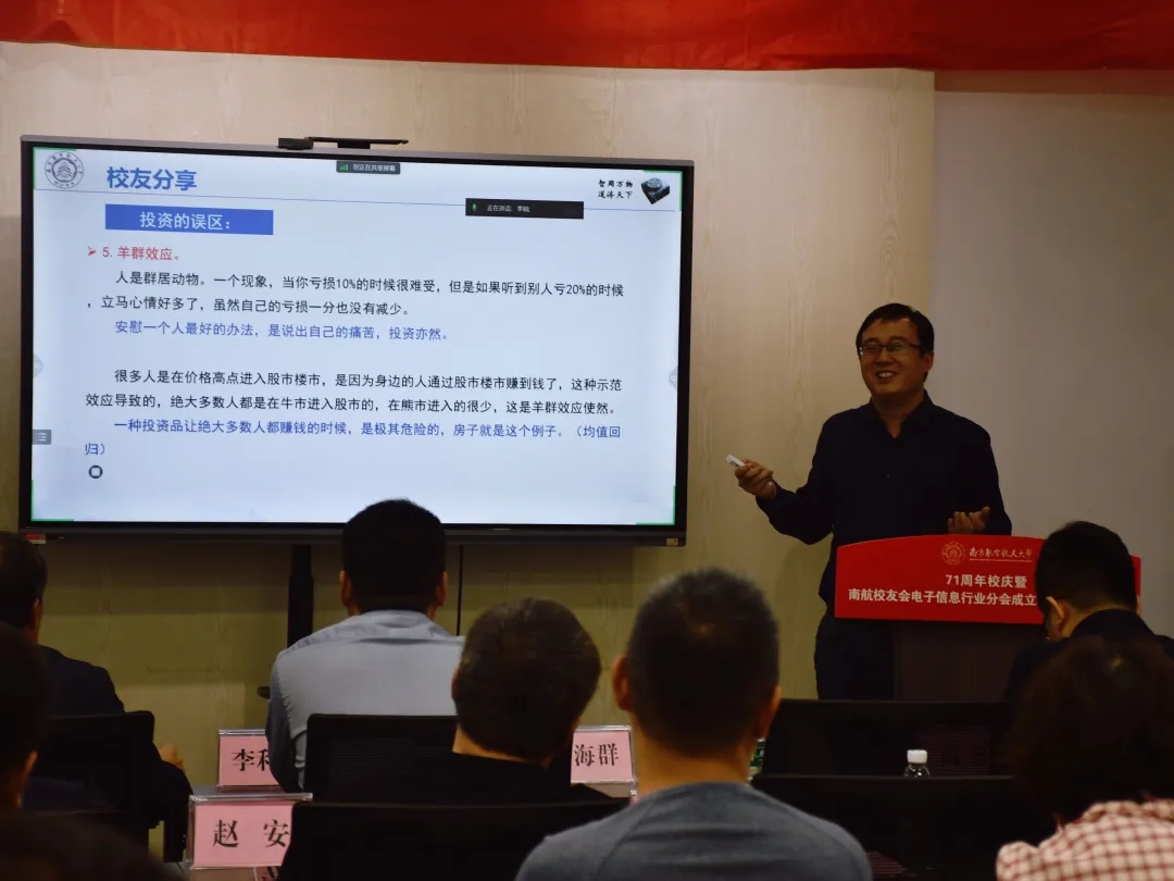 学术报告阶段,96级校友、南京盛砺私募投资基金有限公司总经理张宝生作了题为《如何做好投资——兼谈投资的方法和逻辑》的学术讲座,他从投资的目的和方法出发,总结投资者在投资中常犯的错误,分析产生这些错误的原因以及如何避免产生这些错误。最后,介绍了自己的投资方法和投资逻辑。