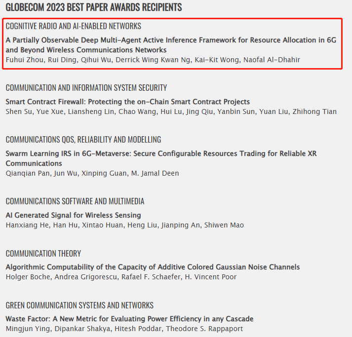 2023年11月2日,IEEE Globecom公布了2023年最佳论文奖入选名单。我院吴启晖副校长领导的天地一体频谱认知智能实验室发表题为《A Partially Observable Deep Multi-Agent Active Inference Framework for Resource Allocation in 6G and Beyond Wireless Communications Networks》的论文成功入选。本次大会共收到来自全球各地专家学者3200余份候选论文,经过论文提名,大会委员会成员评审,积分排名,最终角逐出获奖论文12份,入选率3.75‰。该论文的入选反映我院在信息通信领域取得了具有国际影响力的学术成果,也是我院一直重视面向国家战略需求、面向世界科技前沿等科技创新的重要体现。