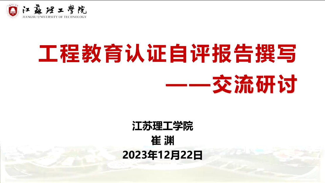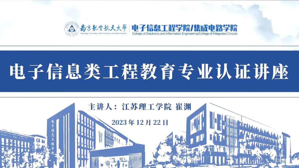为扎实推进学院专业认证自评工作,12月22日下午,我院邀请了江苏理工学院电气信息工程学院崔渊副教授作题为《工程教育认证自评报告撰写》的专题讲座。我院副院长张小飞出席并主持讲座,院长助理夏伟杰、电子科学与技术系副主任王毅、信息与通信工程系副主任晋本周、集成电路系副主任陈鑫及学院教师代表吴一全、陈华伟、陈小敏等参加了讲座。