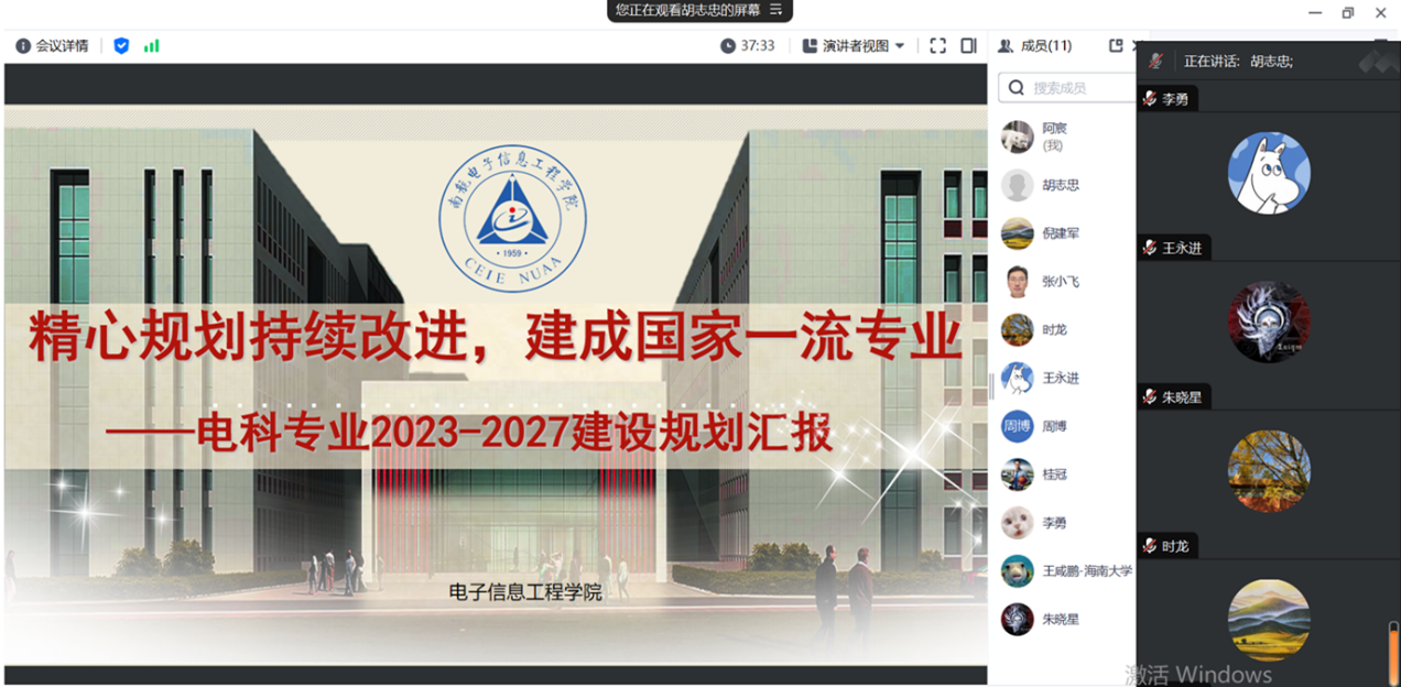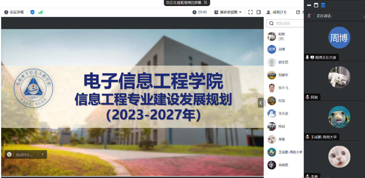 会上,电子信息科学与技术专业执行负责人胡志忠、信息工程专业执行负责人周博就专业定位、发展概况、建设规划、预期成果四方面分别向各位专家汇报了电子信息科学与技术、信息工程专业2023年-2027年专业建设规划,针对专业建设目标和人才培养体系、教师队伍与教学基层组织建设、实验实训条件建设、课程教材资源开发、学生创新创业训练、学生支持与发展、专业建设管理与质量保障体系、专业特色与综合改革成果培育等具体规划进行了详细阐述。