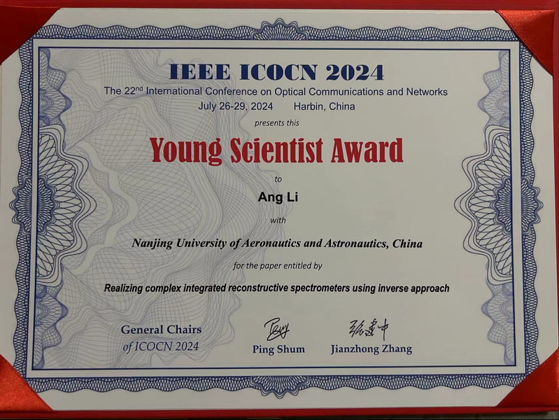 为了促进和表彰青年研究人员在相关领域的研究,会议面向40周岁以下青年人员设置了“青年科学家奖”(Young Scientist Award),通过候选人的学术报告以及专业的评委会打分选举出两位人选。91免费视频 天元实验室李昂教授作了题为“通过逆向设计实现复杂集成重建式光谱仪”的报告并荣获此奖项。