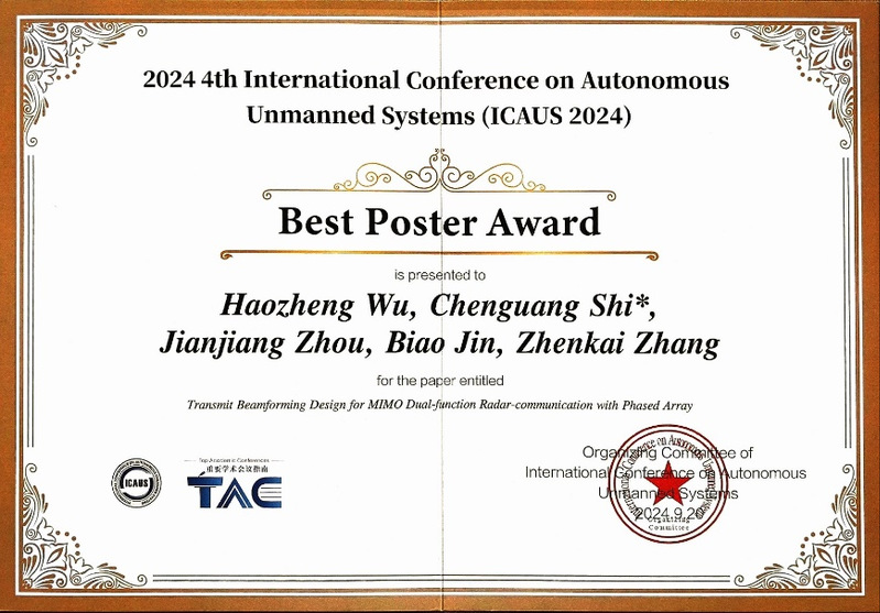 2024年9月19日至9月21日,国际会议The 4th International Conference on Autonomous Unmanned Systems (ICAUS 2024)在沈阳开幕。我院周建江教授课题组博士生武浩正的论文《Transmit Beamforming Design for MIMO Dual-function Radar-communication with Phased Array》获得ICAUS 2024最佳海报奖。本届会议共收稿583篇,其中,20篇论文获得最佳海报奖,占论文总数的3.4%。