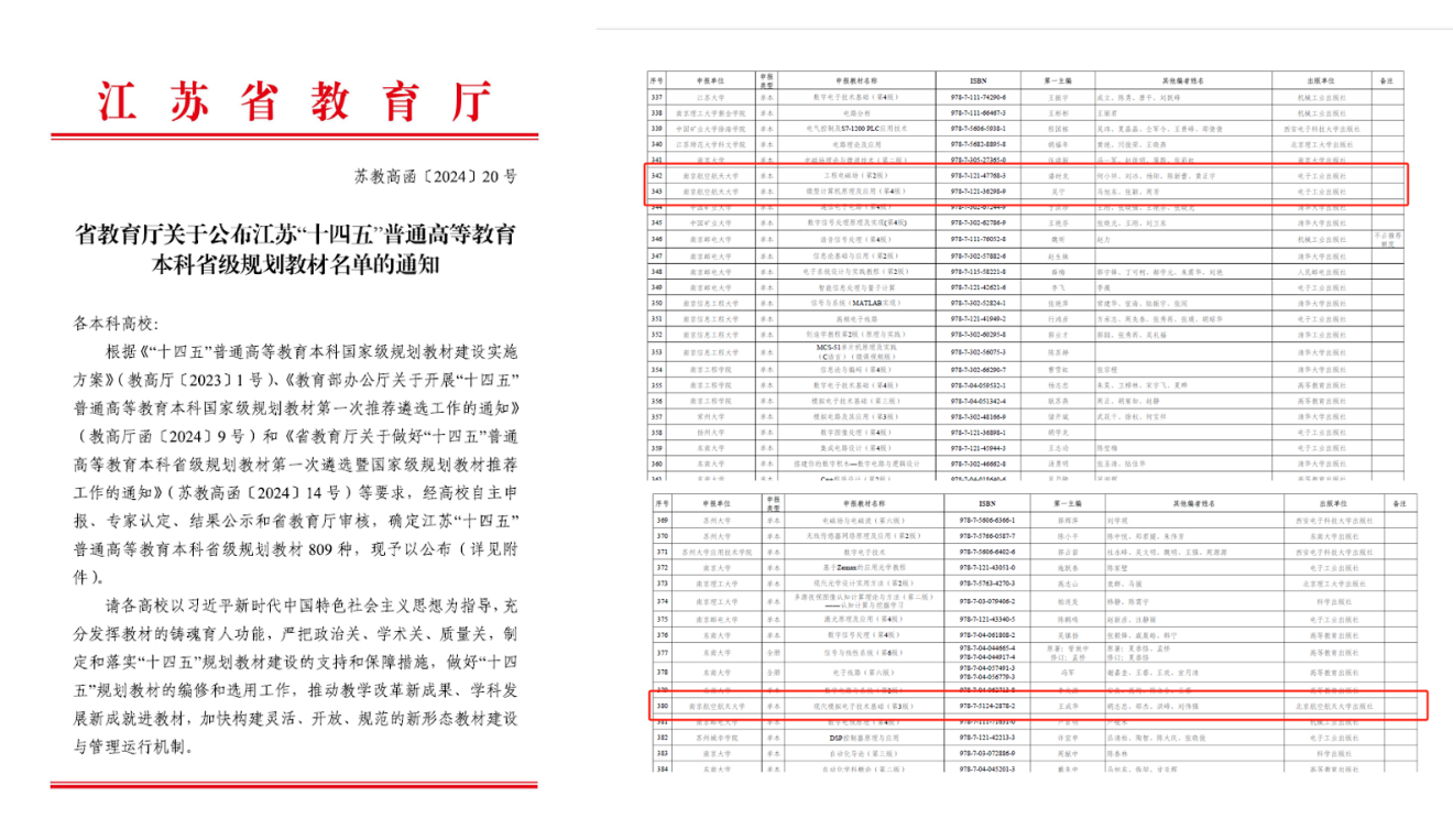 近日,江苏省教育厅发布了《省教育厅关于公布江苏“十四五”普通高等教育本科省级规划教材名单的通知》(苏教高函〔2024〕20号),共确定江苏“十四五”普通高等教育本科省级规划教材809种。我院教师编写的《工程电磁场(第2版)》《微型计算机原理及应用(第4版)》《现代模拟电子技术基础(第3版)》教材成功入选。