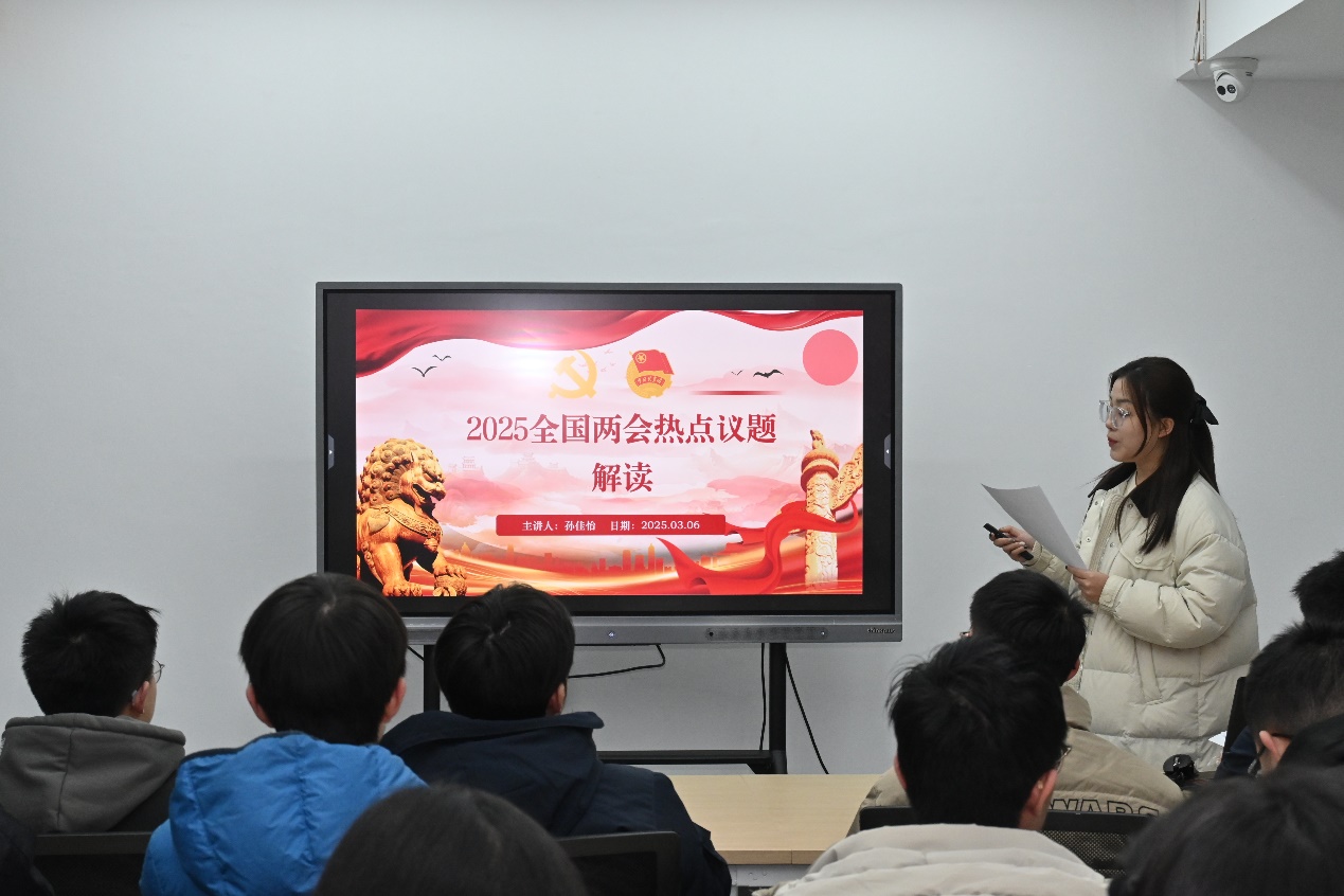 0422202团支部书记孙佳怡领学全国两会精神,重点分享了政府工作报告以及习近平总书记在江苏代表团审议时的讲话内容。她表示,新时代青年应关注国家时事,扎实理论学识,增强实干经验,增强责任感与使命感,把论文写在祖国的大地上,把科技成果应用在实现现代化的伟大事业中。
