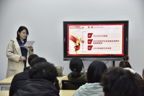 0422205团支部书记侯佳懿领学习近平总书记在全国两会期间的重要讲话精神和全国两会精神,解读全国两会政府工作报告的“新词”“热词”。新时代青年要紧紧围绕党和国家关于发展新质生产力、推进新型工业化的战略部署,把握信息科学发展从自动化到智能化的战略机遇,增强融入科技强国建设的机遇感、使命感、紧迫感,让人工智能赋能硬核科技,引领新质生产力发展。